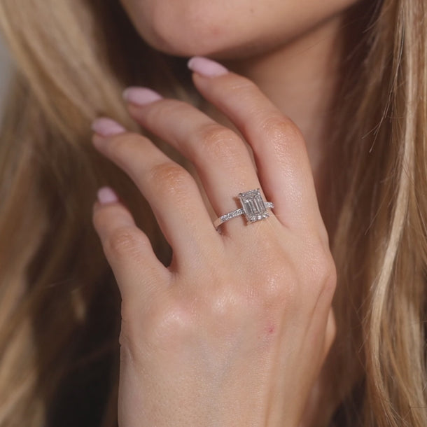 Diamanter: 2.92 ct. totalt fördelat på 11 lab-grown diamanter. Mittstenen på 2.81 ct. emerald_cut-cut diamant och 10 x 0.01 ct.